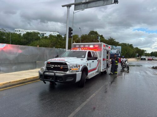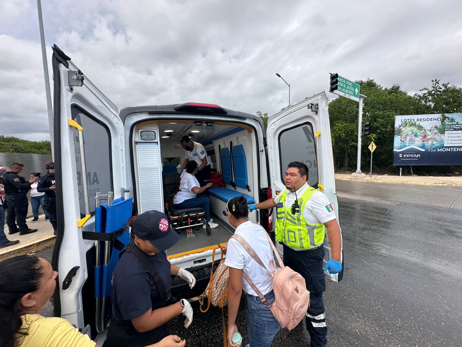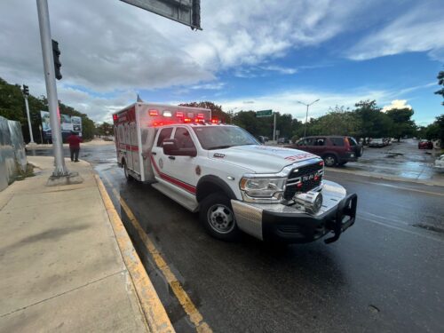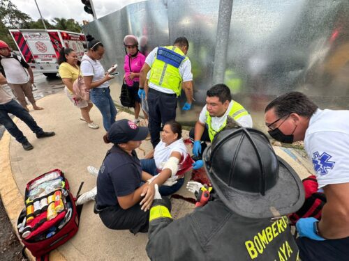 Playa del Carmen.-Una mujer fue trasladada de emergencia al hospital luego de resbalar en un charco y atravesarse el brazo con los tornillos de la base de una luminaria, en hechos ocurridos la tarde de este martes en la colonia Cruz de Servicios.