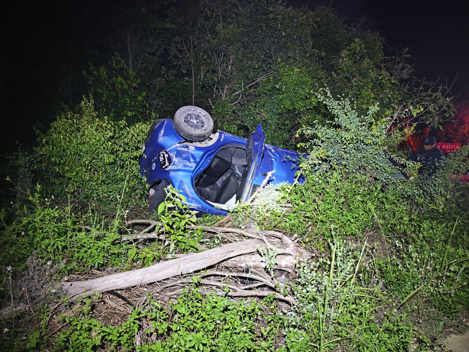 TULUM, Quintana Roo, 09 de octubre de 2025.— La madrugada de este jueves, una mujer que conducía un vehículo Nissan March azul, con placas UTG-168-L, volcó a un costado de la carretera federal Tulum–Felipe Carrillo Puerto, a la altura del kilómetro 224, en dirección al municipio de Tulum.