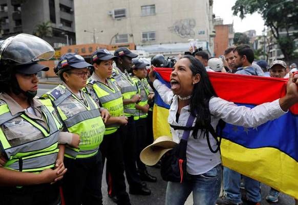 Esta lucha es por el país, la Constitución la están violando, aquí va a haber reconciliación”, dijo la diputada Marialbert Barrios frente a decenas de mujeres policías que encabezaron los piquetes de la fuerza pública que obligaron el desvío de la marcha.