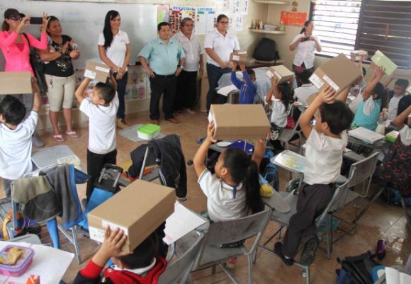 Acompañada por el secretario de Educación y Desarrollo Humano, William Salazar Góngora, y la directora municipal de Educación, Gelmy Uribe Estrella, Laura Fernández entregó cerca de 450 pares de tenis a los menores de la escuela primaria del turno matutino, en el marco del programa “Siguiendo tus pasos”.