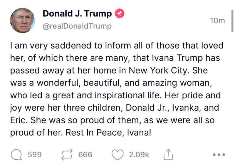 “Estoy triste de informar a quienes la amaban, que son muchos, que Ivana Trump falleció en su casa de la ciudad de Nueva York”, dijo Trump, que se divorció de la exmodelo en 1992, en su cuenta de Truth Social.