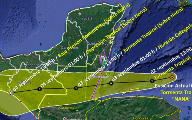 CHETUMAL, Quintana Roo, 2 de septiembre.-La tormenta tropical Nana se localiza a 460 kilómetros al este-sureste de Puerto Costa Maya, Quintana Roo y se espera que la tarde-noche de este miércoles se intensifique a huracán categoría 1.