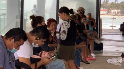 En la sala de espera para abordar el ferry los usuarios nacionales y extranjeros liberan sus rostros de sus cubrebocas, muchos de ellos para poder comer sus alimentos, sin guardar la sana distancia, ante la falta de la personal de la empresa concesionaria de la terminal marítima, Navega que invite a los pasajeros a respetar los protocolos sanitarios.