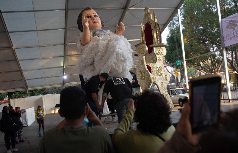 Sobre un imponente trono rojo y dorado, un Niño Dios de cinco metros de altura y media tonelada de peso preside la plaza principal de la alcaldía de Iztapalapa de la Ciudad de México, con un mensaje de esperanza y de salud.