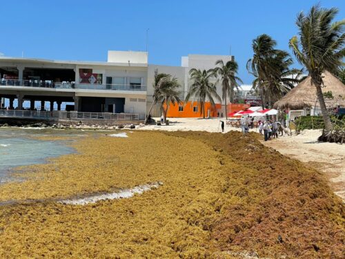 PLAYA DEL CARMEN, Quintana Roo, 11 de mayo. – Los vientos del sureste han traído consigo importantes bancos de sargazo a línea costera de la zona Centro de Playa del Carmen; cuadrillas y maquinaria de la Zona Federal Marítimo Terrestre de Solidaridad trabajan a marchas forzadas en los arenales pero el recale del alga marina es superior.