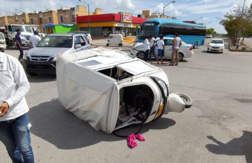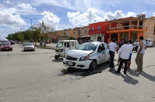 PLAYA DEL CARMEN, Quintana Roo, 16 de enero. – Con un golpe en los brazos y en la espalda que lo dejó sin aire, fue encontrado el conductor de un mototaxi el cual fue impactado por un taxi local que no respetó su alto, en fraccionamiento Villas del Sol, lo que provocó que terminara volcada la unidad de tres ruedas.