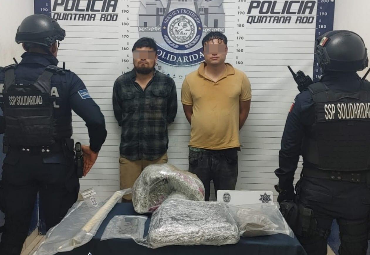 PLAYA DEL CARMEN, Quintana Roo, 31 de enero. – Al implementar acciones de vigilancia y prevención del delito, policías de la Secretaría de Seguridad Pública y Tránsito Municipal de Solidaridad aseguraron a dos sujetos en posesión de posible marihuana en la colonia Ejido.