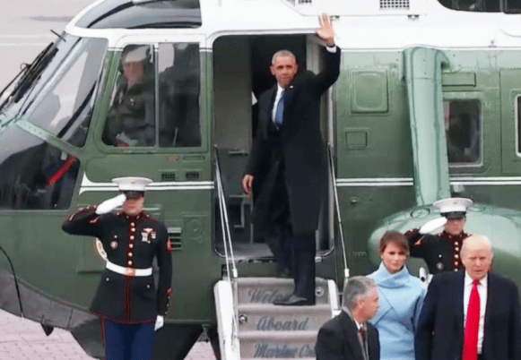 WASHINGTON, E.U. 20 de Enero.- El ex presidente Barack Obama abordó este viernes un helicóptero de la Marina para dirigirse a la base Aérea de Andews y desde allí dejar Washington luego de ocho años en la Casa Blanca.