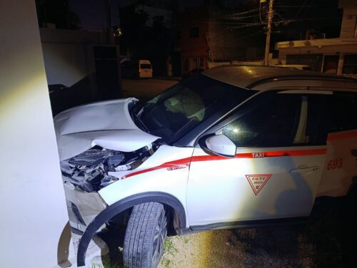 TULUM, Quintana Roo, 30 de septiembre de 2025.— Un taxista del sindicato Tiburones del Caribe, identificado con el número económico 693, ocasionó un aparatoso incidente la noche del lunes al impactar su vehículo contra la fachada de una vivienda en la colonia Mayapax.