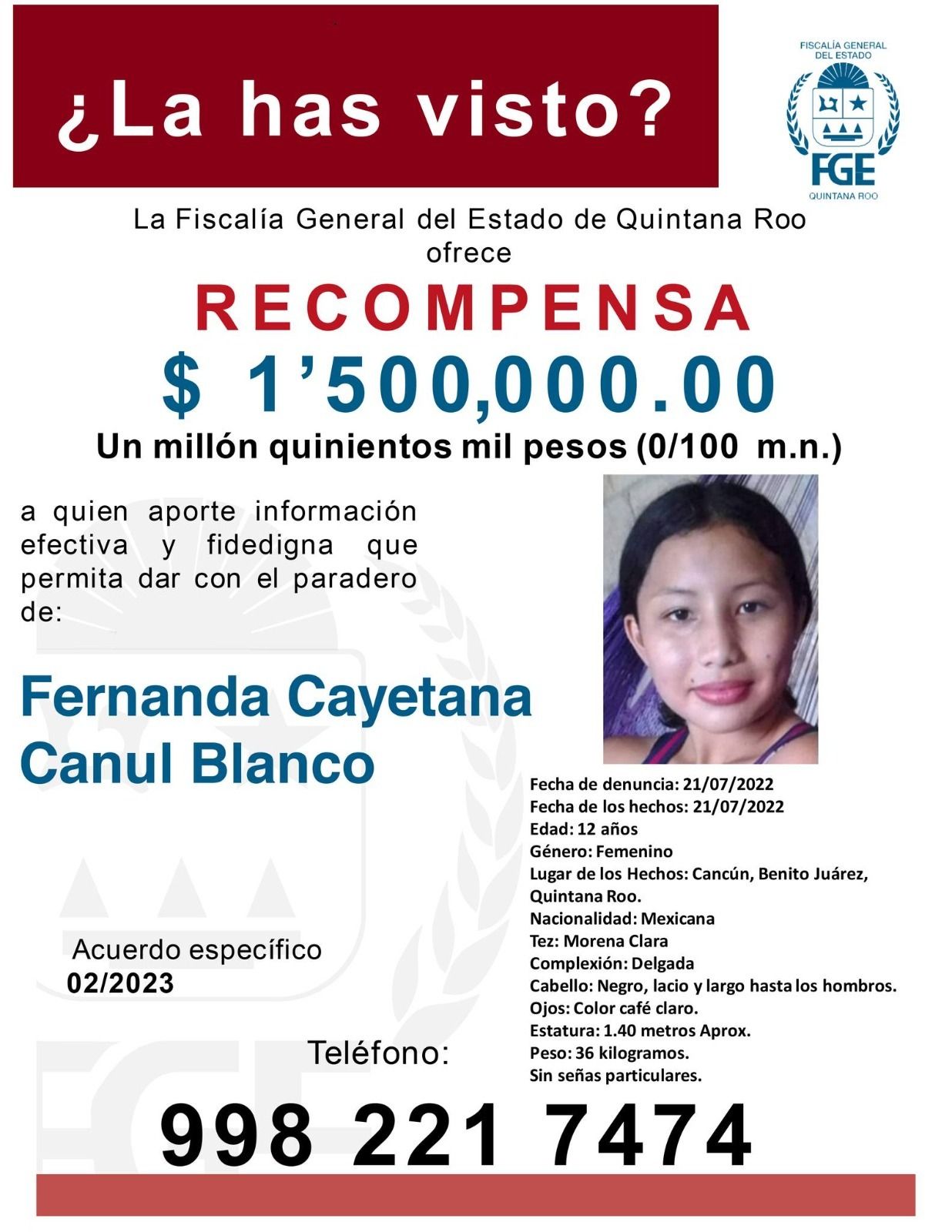 CANCÚN, Quintana Roo, a 17 de mayo de 2023.- Por primera vez en la historia de Quintana Roo, la Fiscalía General del Estado, encabezada por Óscar Montes de Oca, ofrece una recompensa de un millón 500 mil pesos a quien aporte información útil y efectiva que lleve a la localización de la niña desaparecida Fernanda Cayetana.