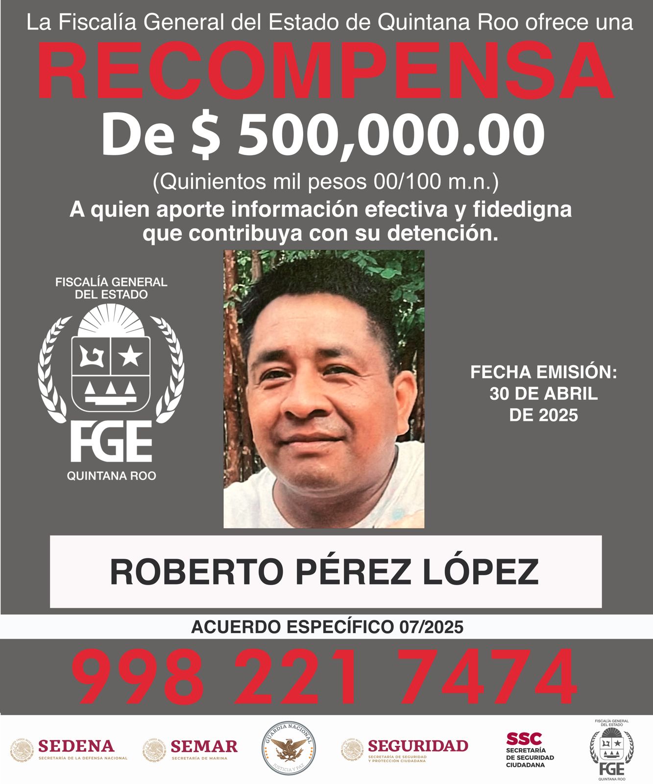 La Fiscalía General del Estado publicó la recompensa de 500 mil pesos a quien de información que lleve a la captura de Pérez López, información que deberá ser proporcionada al número 9982217474 o llamando al 911.