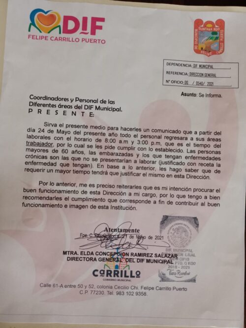FELIPE CARRILLO PUERTO, Quintana Roo, 25 de mayo. – Sin tomar en consideración el riesgo de contagio de Covid 19, este lunes se pidió a todos los trabajadores del Sistema Municipal para el Desarrollo Integral de la Familia de Felipe Carrillo Puerto reintegrarse a sus labores.