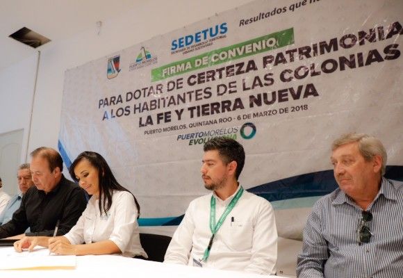 PUERTO MORELOS, Quintana Roo, 6 de marzo.- El Gobierno del Estado y el Ayuntamiento de Puerto Morelos firmaron esta tarde un convenio para otorgar certeza patrimonial a los habitantes de las colonias Tierra Nueva y La Fe.