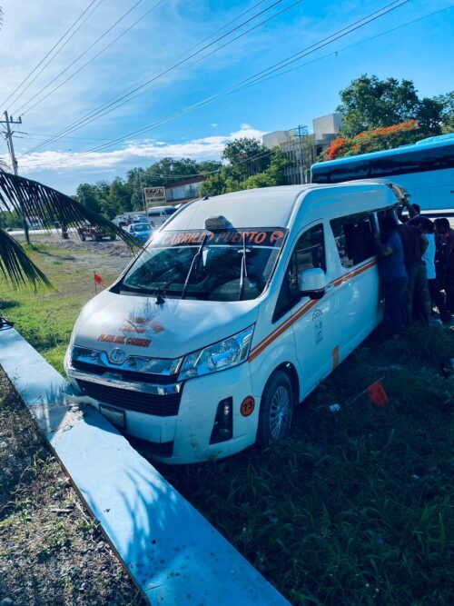 Esto en la salida de Tulum hacia Felipe carrillo Puerto, cuando el operador del autobús de dicha empresa le pega por alcance a un colectivo del sindicato de la UNTRAC, el cual pierde el control y se estampa contra una barda.