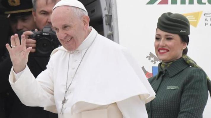A su llegada fue recibido por el primer ministro egipcio, Sherif Ismail, y por autoridades eclesiásticas previo a la conferencia internacional de la paz en donde participará con el objetivo de enviar un mensaje de reconciliación entre las religiones, señaló que durante su estadía en este país no viajará en vehículos blindados. El avión llegó alrededor de las 14:00 horas (tiempo local) de este viernes al Aeropuerto Internacional de El Cairo tras un viaje de unas tres horas.