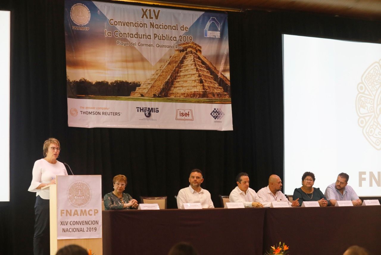 PLAYA DEL CARMEN, Quintana Roo, 15 de noviembre.- La presidente municipal, Laura Beristain Navarrete, acompañó al gobernador de Quintana Roo, Carlos Joaquín González, a la inauguración de la XLV Convención Nacional de la Contaduría Pública 2019, que sirvió de marco para la toma de protesta de los integrantes de la Federación Nacional de la Asociación Mexicana de Colegios de Contadores Públicos A.C. (FNAMCP), celebrado en esta ciudad.