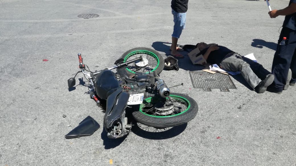 El motociclista salió volando de su vehículo y estrellándose contra la patrulla, por lo que quedó tendido en el pavimento, lesionado.