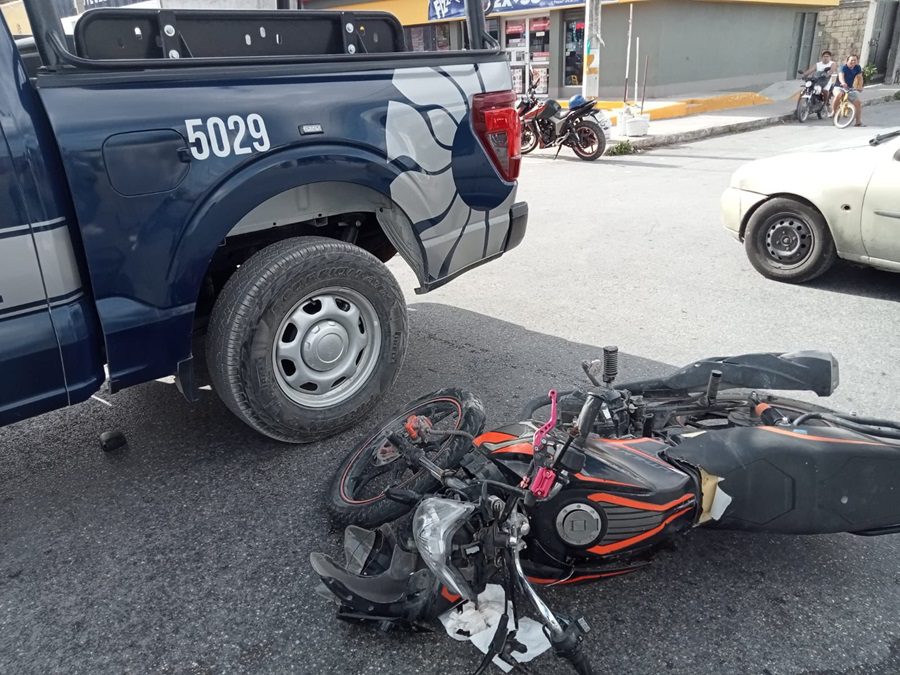 Lo antes dicho provocó que se le impactara en el costado el conductor de una motocicleta, quien circulaba con preferencia de paso sobre la avenida Centenario, tras la colisión, el motociclista salió proyectado contra el pavimento, sufriendo múltiples golpes.