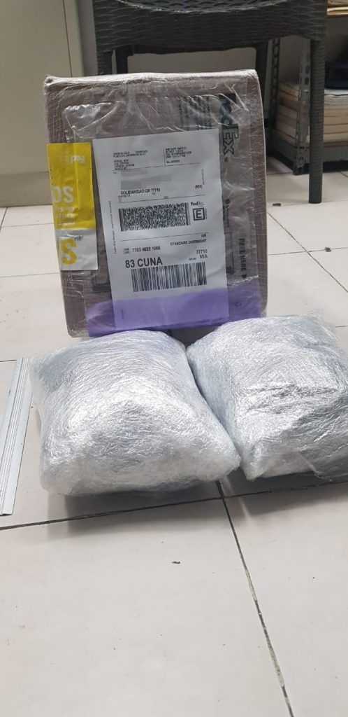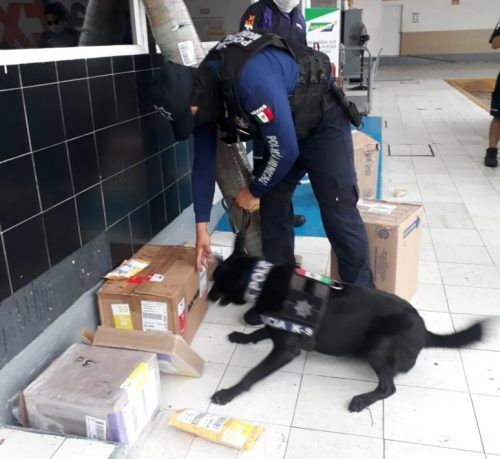 PLAYA DEL CARMEN, Quintana Roo, 1 de mayo.- Elementos de la Unidad Canina de la Secretaría de Seguridad Pública y Tránsito Municipal de Solidaridad realizaron el aseguramiento de 5 paquetes de los cuales cuatro contenían en su interior hierba verde con las características de la marihuana y uno polvo blanco similar a la droga conocida como cocaína, en el local de una empresa de paquetería en la colonia Centro.