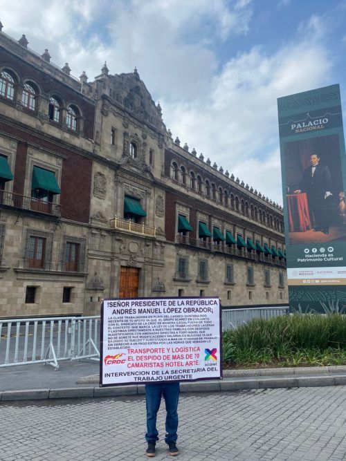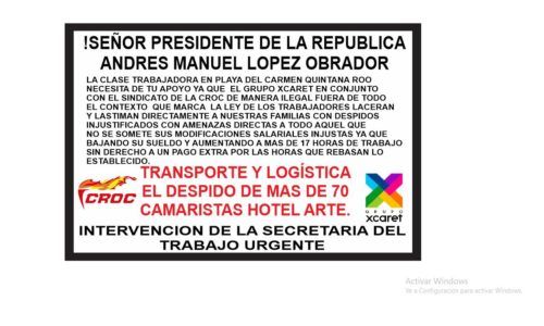 La imagen de los empleados a las puertas del Palacio Nacional muestra dos lonas con diferentes mensajes: el primero un llamado al presidente de la República que señala que la clase trabajadora en Playa del Carmen necesita su ayuda porque Grupo Xcaret y el Sindicato de la CROC laceran y lastiman #”directamente a nuestras familias con despidos injustificados, con amenazas directas a todo aquel que no se somete (a) sus modificaciones salariales injustas ya que bajando su sueldo y aumentando a más de 17 horas de trabajo sin derecho a un pago extra por las horas que rebasan lo establecido”.