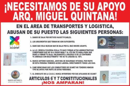 Además, enumeran las razones entre las que destacan las bajas por motivos injustificados, la falta de apoyo y que el sindicato de la CROC “nunca interfiere por sus afiliados en Xcaret”.