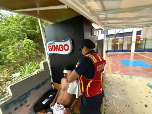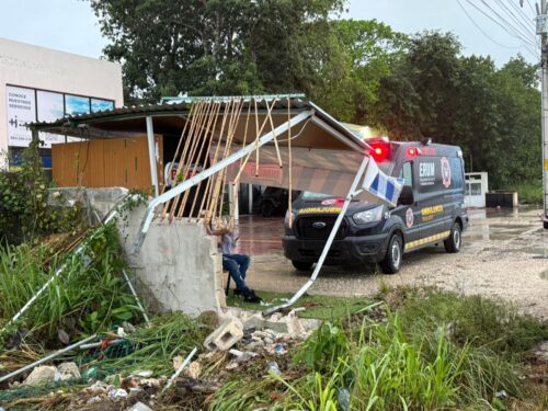 PLAYA DEL CARMEN, Quintana Roo, 17 de septiembre de 2025.– Un conductor resultó lesionado luego de perder el control de su vehículo al pasar sobre un charco bajo el puente de esta alcaldía, lo que provocó que se saliera de la vialidad y se impactara contra la base del techo de un negocio.