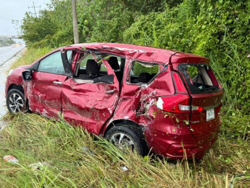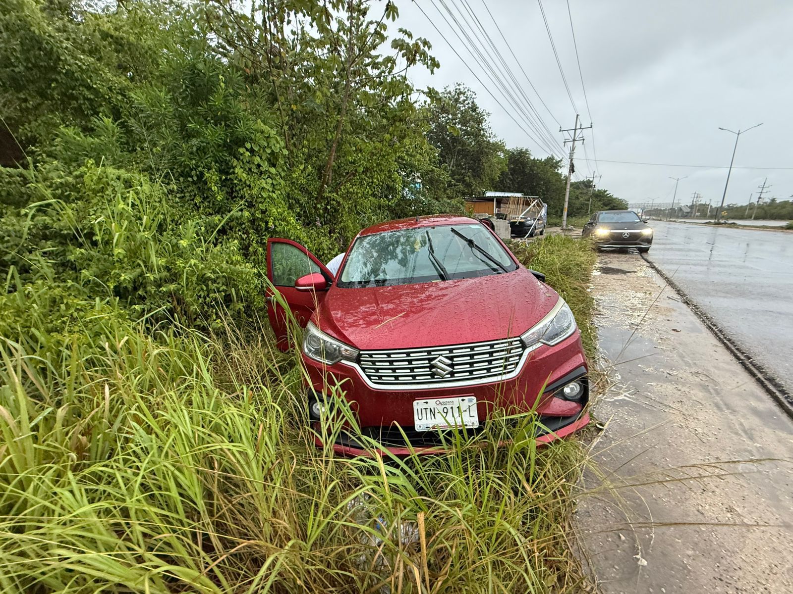El percance ocurrió alrededor de las 8:00 de la mañana, cuando el conductor de un Suzuki Ertiga rojo, que circulaba en dirección sur sobre la carretera federal 307, descendió del puente de Puerto Aventuras a velocidad excesiva. Al pasar sobre un charco, perdió el control del volante, salió de la vía y terminó impactándose contra un pequeño techo de un establecimiento, para posteriormente quedar en un área arbolada.