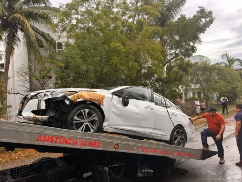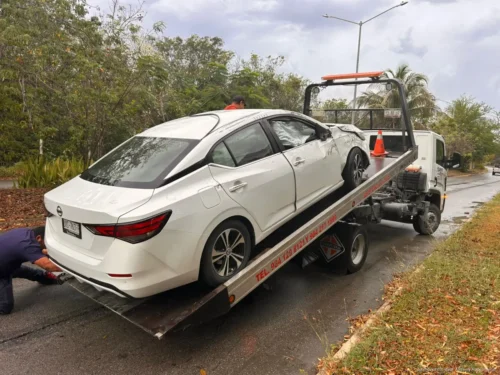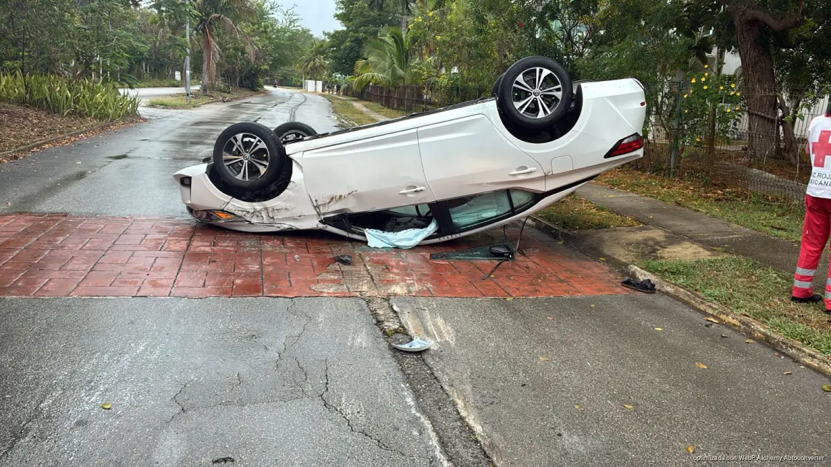 PLAYA DEL CARMEN, Quintana Roo, 17 de marzo de 2026.— Una mujer terminó volcada con su vehículo la mañana de este lunes en las inmediaciones del fraccionamiento Villa Maya, luego de perder el control por el pavimento mojado.