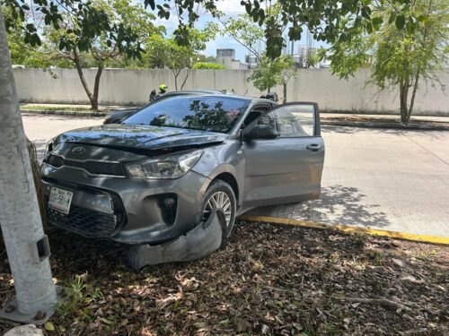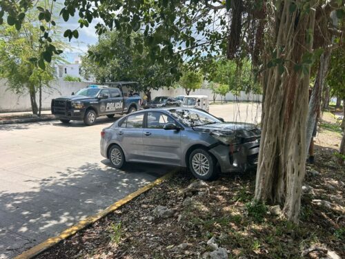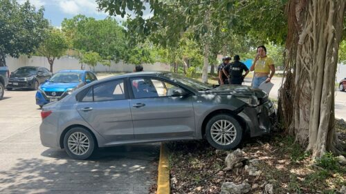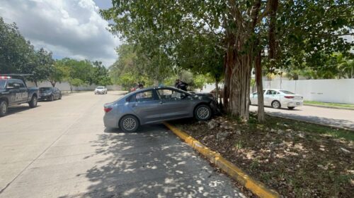 Playa del Carmen, Q. Roo.- Un joven conductor de aproximadamente 19 años chocó este martes contra un árbol en el camellón central de la avenida Flor de Ciruelos, a la altura del fraccionamiento Palmas 2, luego de perder el control al tomar una curva sobre pavimento mojado.