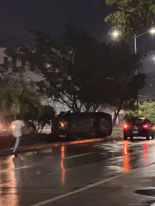 PLAYA DEL CARMEN, Quintana Roo, 07 de abril de 2026.- Un aparatoso accidente se registró la noche de este martes en la colonia Ejido, luego de que el conductor de un vehículo perdiera el control al circular a exceso de velocidad sobre pavimento mojado, terminando por impactarse contra una luminaria y volcar.
