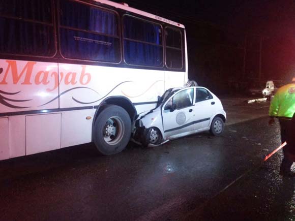 El chofer del camión señaló que sintió la sacudida en la unidad por el impacto  por lo que el compacto había quedado incrustado hasta la mitad, en la parte trasera del autobús Mercedes Benz de la compañía de transporte Mayab, con placas de circulación 890-JV-4.