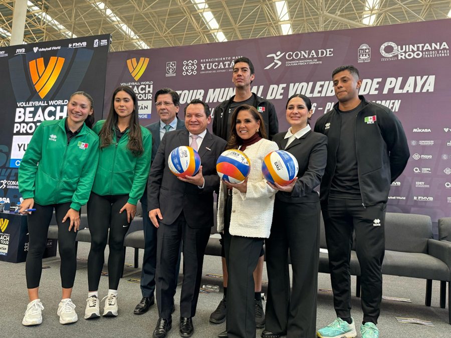 Ciudad de México, 17 de febrero de 2025.- La presidenta municipal de Solidaridad, Estefanía Mercado, acompañó hoy a la gobernadora de Quintana Roo, Mara Lezama, a la presentación del Tour Mundial de Voleibol de Playa 2025, que tendrá dos fechas del circuito en México, la primera de ellas en el Challenge Yucatán en el puerto de Progreso, del 19 al 23 de marzo, y la segunda el Élite 16 Playa del Carmen, del 26 al 30 del mismo mes, con la presencia de los mejores exponentes del orbe.
