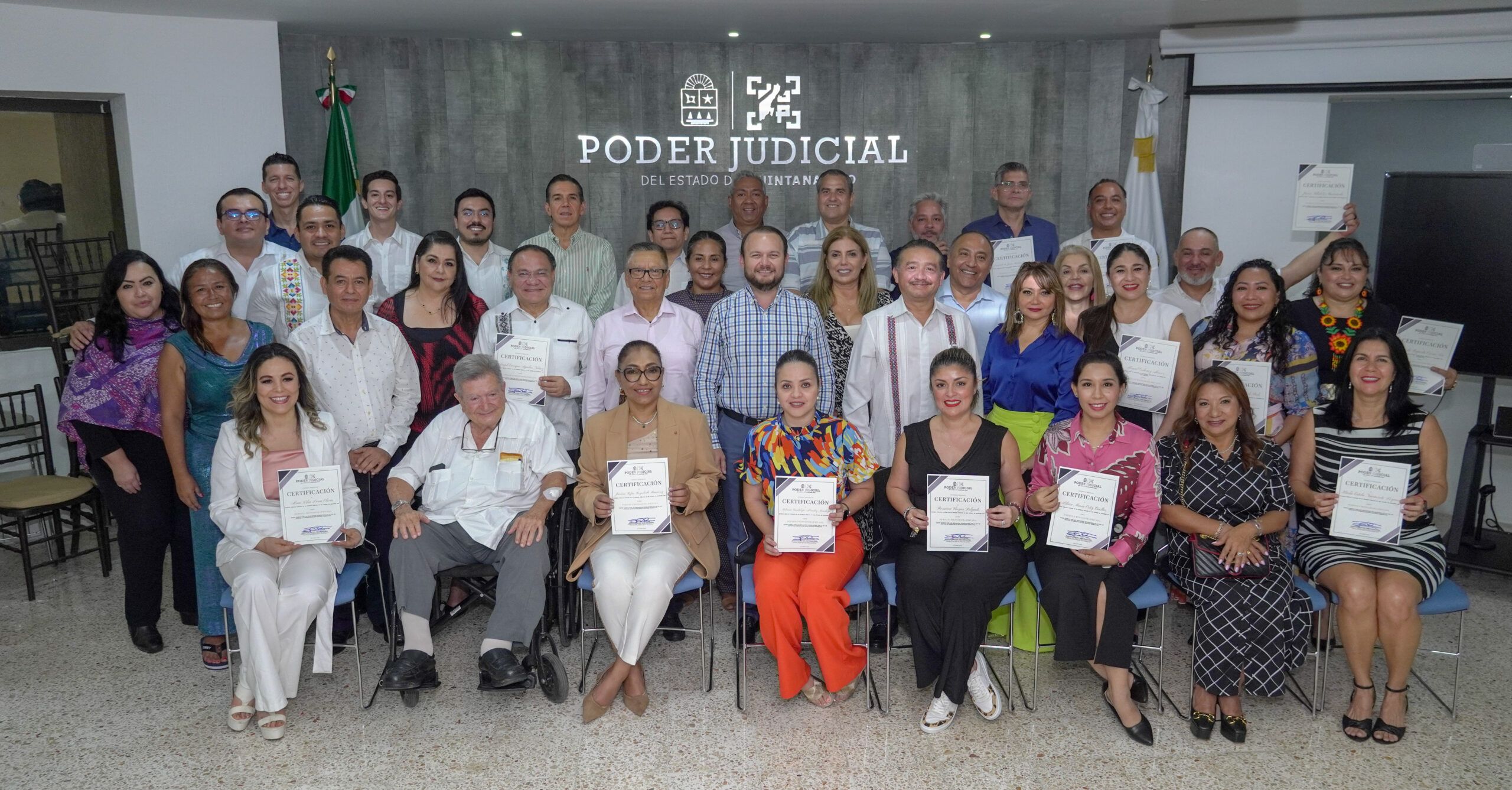 En esta ceremonia, realizada en el Salón María Teresa Castro Ríos del Palacio de Justicia de Cancún, en la que el Magistrado Presidente estuvo acompañado en el presídium por el Magistrado Ángel Ysidro Quintal Quintal, Director de la Escuela Judicial; también asistieron como invitados de honor: el Consejero Ciudadano, José Joaquín González Castro; el Lic. Gastón Alegre López; el Director del Centro de Justicia Alternativa, Juan Castro Palacios; el Director del Instituto de la Defensoría Pública, Fabián Gamboa Song y la Titular de la Unidad de Certificación y Mediación Privada, Flor Azalia Gómez Canto.