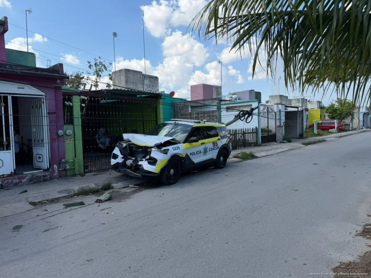 Cancún, 24 de marzo de 2026.- Una patrulla de la Policía de Cancún terminó convertida en pérdida total, por los daños tras un aparatoso accidente registrado la mañana de este martes en el fraccionamiento Villas del Mar III, donde un elemento perdió el control de la unidad y provocó una cadena de impactos que dejó diversas afectaciones materiales.