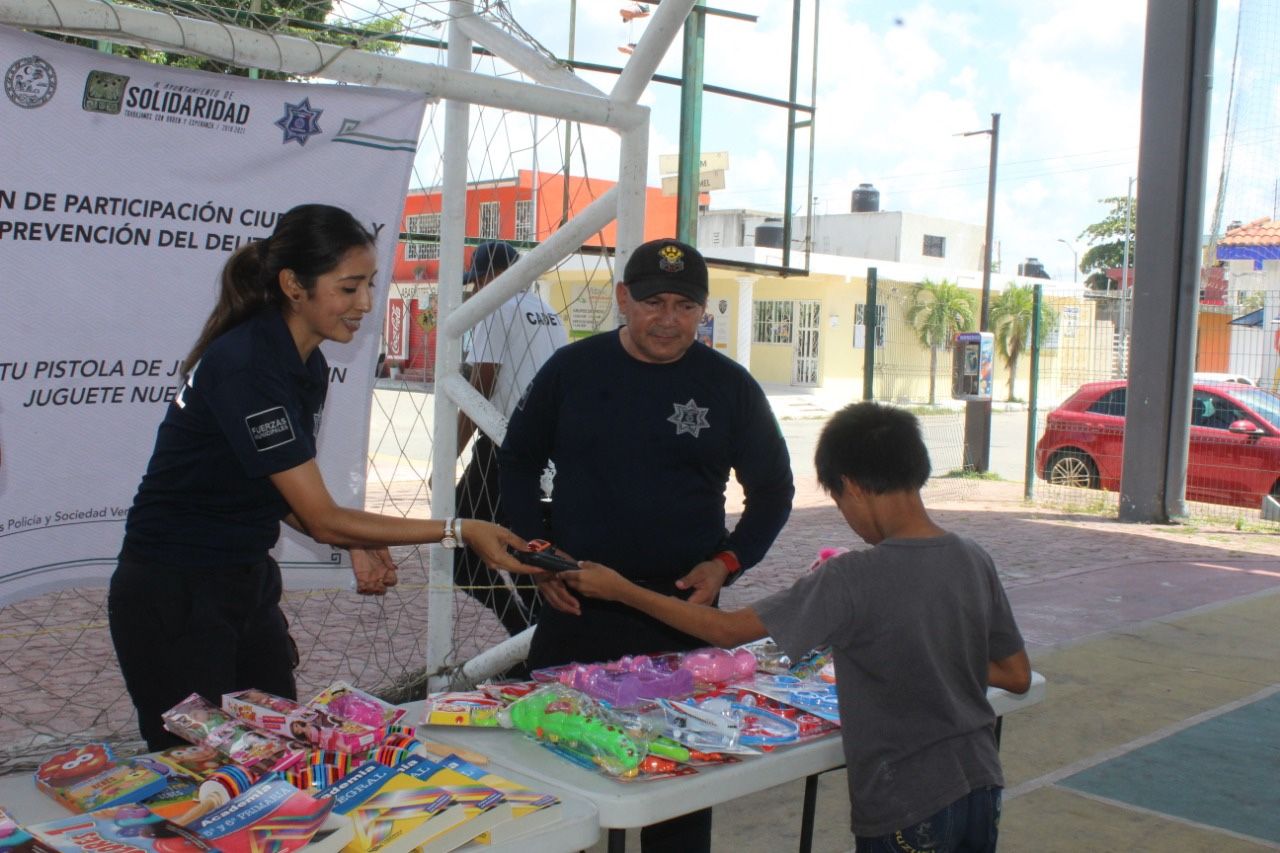 PLAYA DEL CARMEN, Quintana Roo, 09 de agosto.- En el marco de las estrategias de prevención que promueve el gobierno de la presidenta municipal, Laura Beristain Navarrete, la Dirección General de Seguridad Pública y Tránsito de Solidaridad, a cargo del comandante Jorge Robles Aguilar, ha realizado 14 jornadas del programa “Cambia tu pistola de juguete por un juguete nuevo” mediante el cual más de 390 niños han intercambiado un juguete réplica de armamento por uno tradicional, didáctico o deportivo, con el fin de evitar patrones de conducta violentos e incentivar el sano esparcimiento y la convivencia familiar por un Solidaridad más seguro para todos.