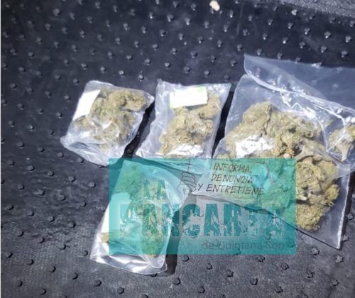 PLAYA DEL CARMEN, Quintana Roo, 27 de noviembre.- Elementos de la Policía Municipal Preventiva logró la detención de dos sujetos con la portación de cuatro bolsas con mariguana a su interior, luego de ser detenidos por conducir de manera temeraria un automóvil compacto Chevrolet, color gris, placas de circulación URH-482-F de Quintana Roo.