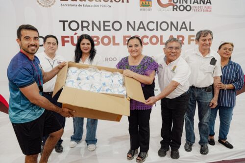 Chetumal.- La titular de la Secretaría de Educación en Quintana Roo (SEQ), Elda Xix Euán, en representación de la gobernadora Mara Lezama Espinosa, encabezó la inauguración de la etapa estatal del “Torneo Nacional de Fútbol FMF”, evento en el que entregó balones a los participantes y premió a los ganadores, quienes nos representarán en el certamen nacional a celebrarse en la Ciudad de Toluca, Estado de México, del 9 al 13 de junio del presente año.
