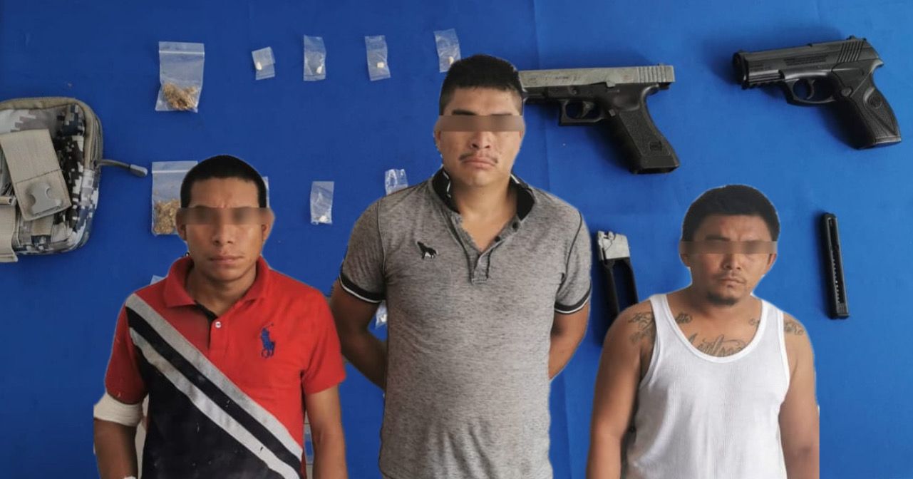 En una tarjeta informativa, la Policía Quintana Roo, dio a conocer que a Huber L.M., de 20 años de edad, José G.X., de 25 años y Luis G.A.F., de 26 años de edad se les acusa de tentativa de homicidio y delitos contra la salud.