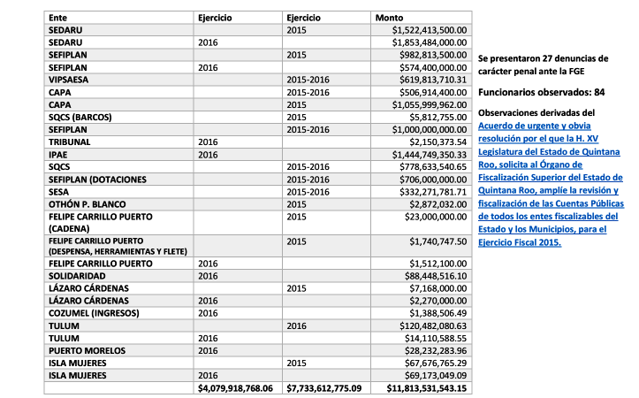 CHETUMAL, Quintana Roo, 31 de agosto. – La Auditoría Superior del Estado, a cargo de Manuel Palacios Herrera, auditor interino, informó a los integrantes de la XV Legislatura, que se encuentran en curso la presentación de 27 denuncias penales en contra de funcionarios de la administración pasada, estatales y municipales, por el presunto mal manejo de más de 11 mil 813 millones de pesos del erario público.