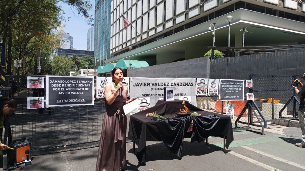 Organizaciones civiles y compañeros del periodista Javier Valdez se manifestaron a las afueras de la embajada de Estados Unidos en la Ciudad de México para exigir “justicia” y la extradición de Dámaso López Serrano, alias ‘el Mini lic’, acusado de ser el autor intelectual del asesinato del comunicador hace ocho años en Sinaloa.