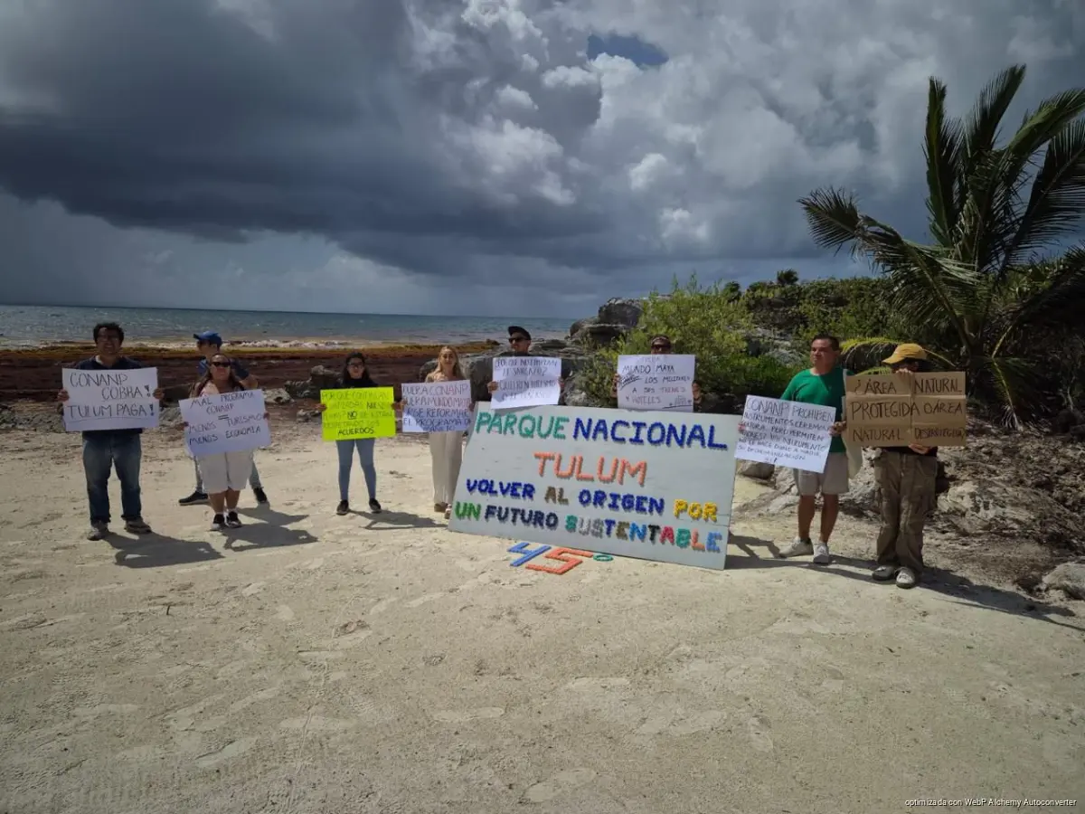 TULUM, Quintana Roo, 23 de abril de 2026.- Integrantes del colectivo Playas Libres se manifestaron durante el 45 aniversario del Parque Nacional Tulum para denunciar presuntos abusos por parte de la Comisión Nacional de Áreas Naturales Protegidas (CONANP) y el impacto de sus recientes disposiciones en la actividad turística y comercial.