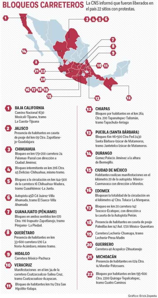 En las últimas 48 horas, personas incoformes con el aumento al precio de las gasolinas realizaron 22 bloqueos y manifestaciones en carreteras federales de los estados de México, Querétaro Michoacán, Chiapas, Chihuahua, Sonora, Oaxaca, Zacatecas y Veracruz.