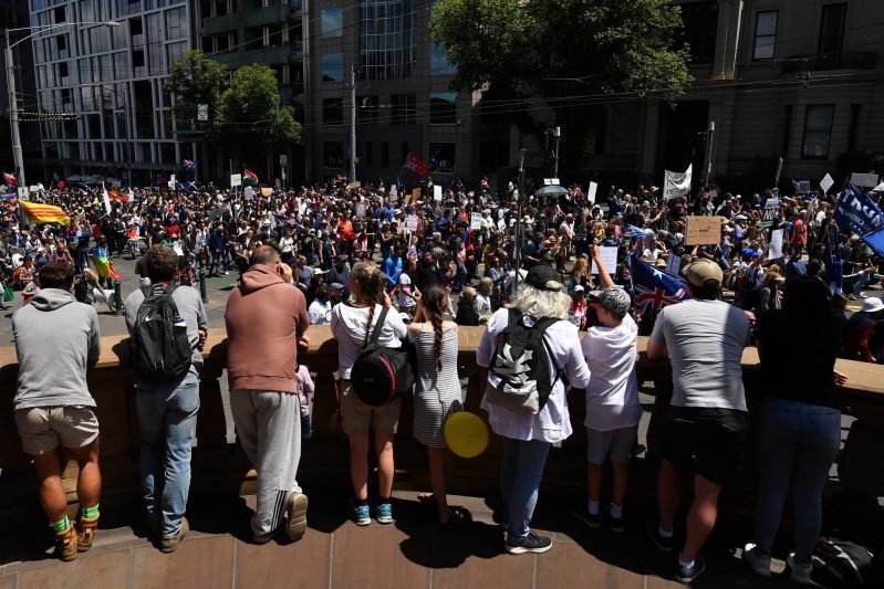 Miles de personas se manifestaron de manera pacífica frente al Parlamento de Victoria, en la ciudad australiana de Melbourne, para demandar la retirada de las leyes contra la pandemia del COVID-19.
