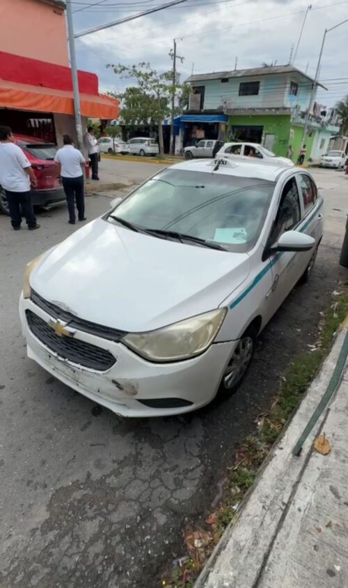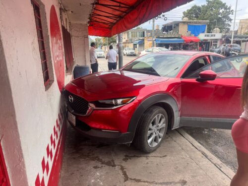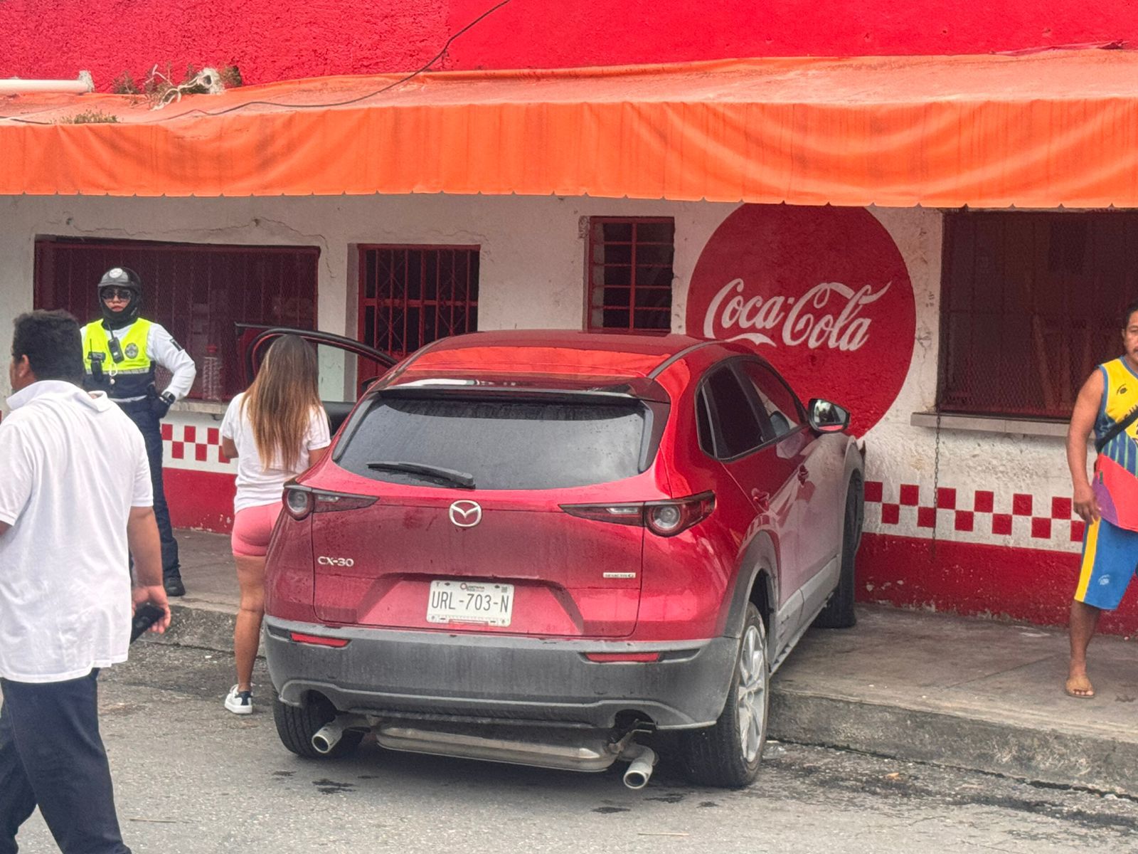 PLAYA DEL CARMEN, Quintana Roo, 29 de diciembre de 2025.— Un accidente vial se registró la tarde de este lunes en la colonia Colosio, luego de que la conductora de una camioneta cruzó sin precaución, provocando que fuera impactada por un taxi y terminara sobre la banqueta, a escasos centímetros de un negocio de comida.