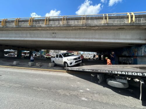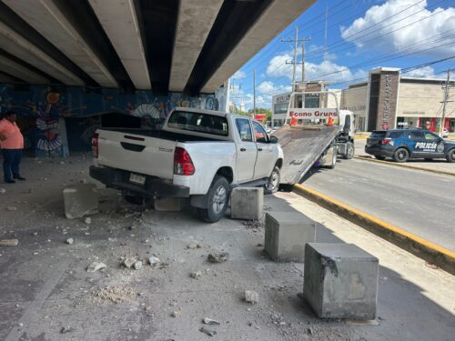 PLAYA DEL CARMEN, Quintana Roo, 11 de octubre de 2025.— La imprudencia al volante provocó un aparatoso accidente la tarde de este sábado, luego de que la conductora de una camioneta no respetara el señalamiento de alto en el bulevar Playa del Carmen, impactando a otro vehículo que terminó dentro del bajo puente con diversos daños materiales.