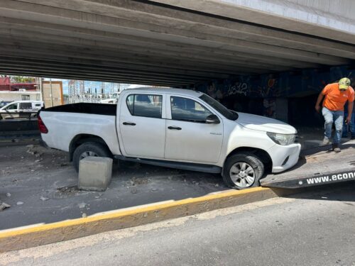El impacto fue de tal magnitud que la camioneta afectada perdió el control y salió de la vialidad, quedando atorada en el camellón, justo debajo del puente vehicular, lo que ocasionó un intenso congestionamiento durante varios minutos.