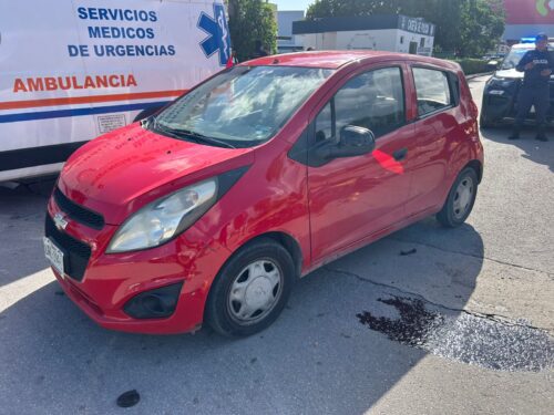 El conductor del automóvil impactó al motociclista, quien salió proyectado de la unidad de dos ruedas. A consecuencia del choque, la motocicleta continuó su trayectoria y se estrelló contra un Chevrolet Spark, color rojo, que en ese momento salía del estacionamiento de la plaza, golpeándolo en uno de los costados, lo que provocó que las tres unidades quedaran obstruyendo la vialidad.