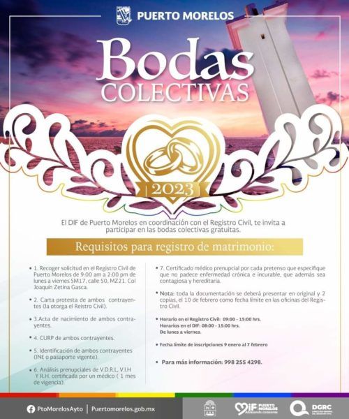 PUERTO MORELOS, Quintana Roo, 05 de febrero. –  El gobierno de Puerto Morelos reiteró la invitación a las parejas de Puerto Morelos y otros municipios, a contraer matrimonio por la vía civil, el próximo 14 de febrero durante las Bodas Colectivas 2023, que se llevarán a cabo en el Casco Antiguo de la cabecera municipal.