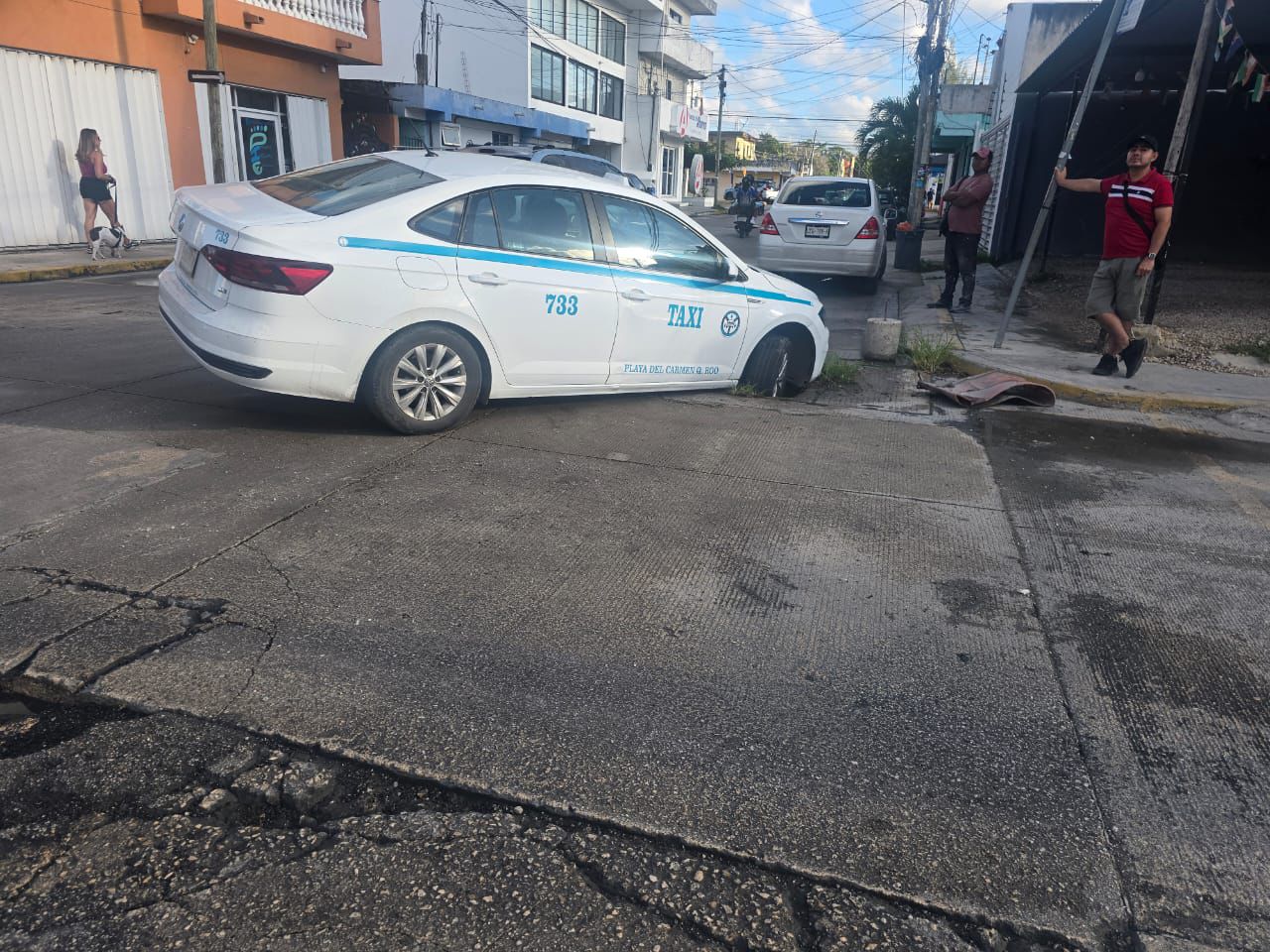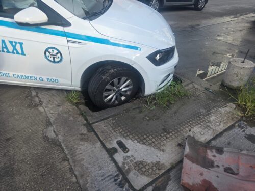 PLAYA DEL CARMEN, Quintana Roo, 22 de noviembre de 2025.— Queda un taxi atrapado dentro de un registro de la Comisión Federal de Electricidad (CFE) luego de que la tapa cediera al paso del vehículo, provocando que una parte de la unidad quedara hundida y sin posibilidad de moverse.