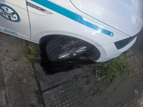 El chofer no advirtió que la tapa del registro se encontraba debilitada, y al pasar sobre ella esta se rompió en la parte central, lo que ocasionó que el vehículo quedara atrapado al interior. Ante la situación, el conductor solicitó apoyo a través del número de emergencias 911 y notificó a su aseguradora, mientras que agentes de Tránsito Municipal llegaron para iniciar el deslinde de responsabilidades.